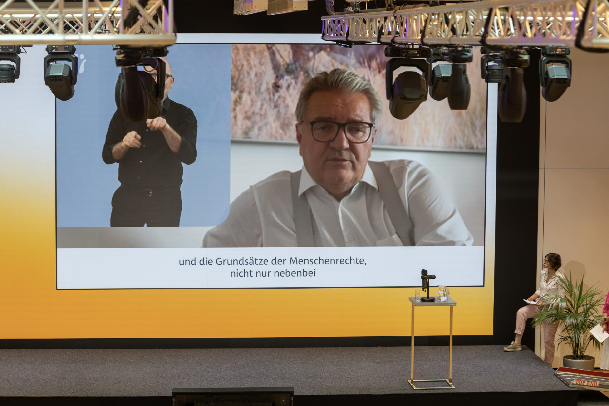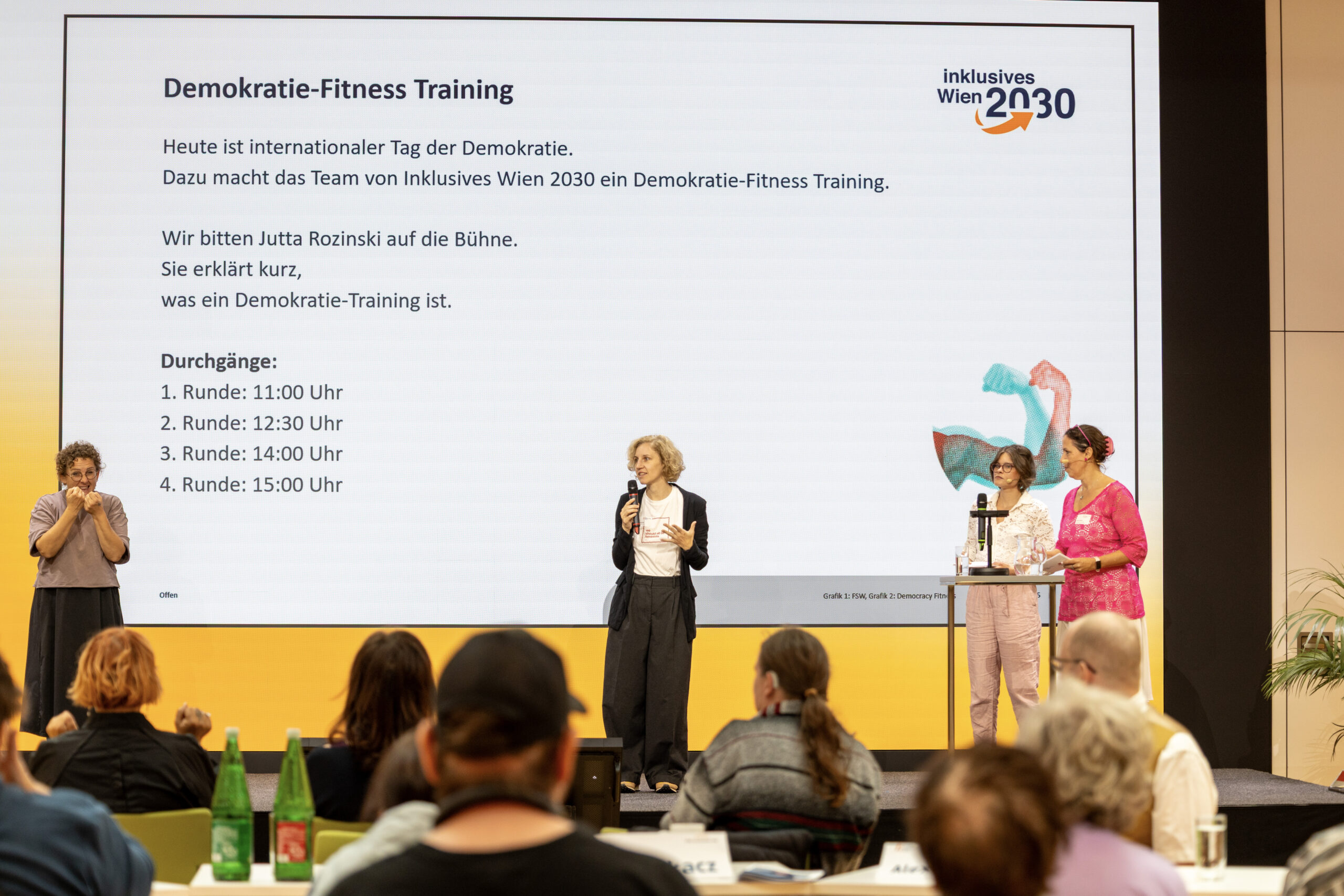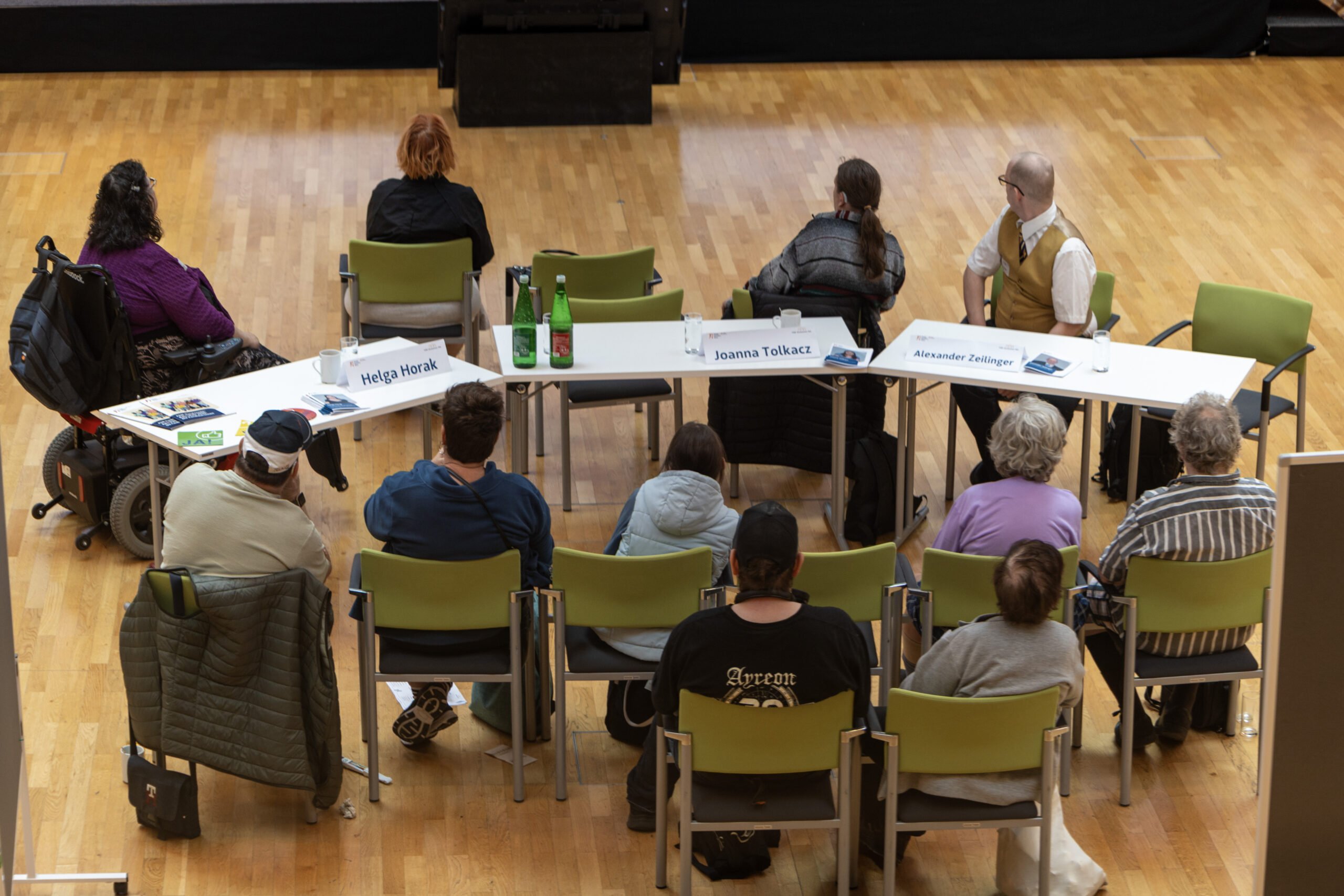 Die kandidat:innen sitzen am Anfang des Raums an einem Tisch. man sieht das Publikum von hinten.