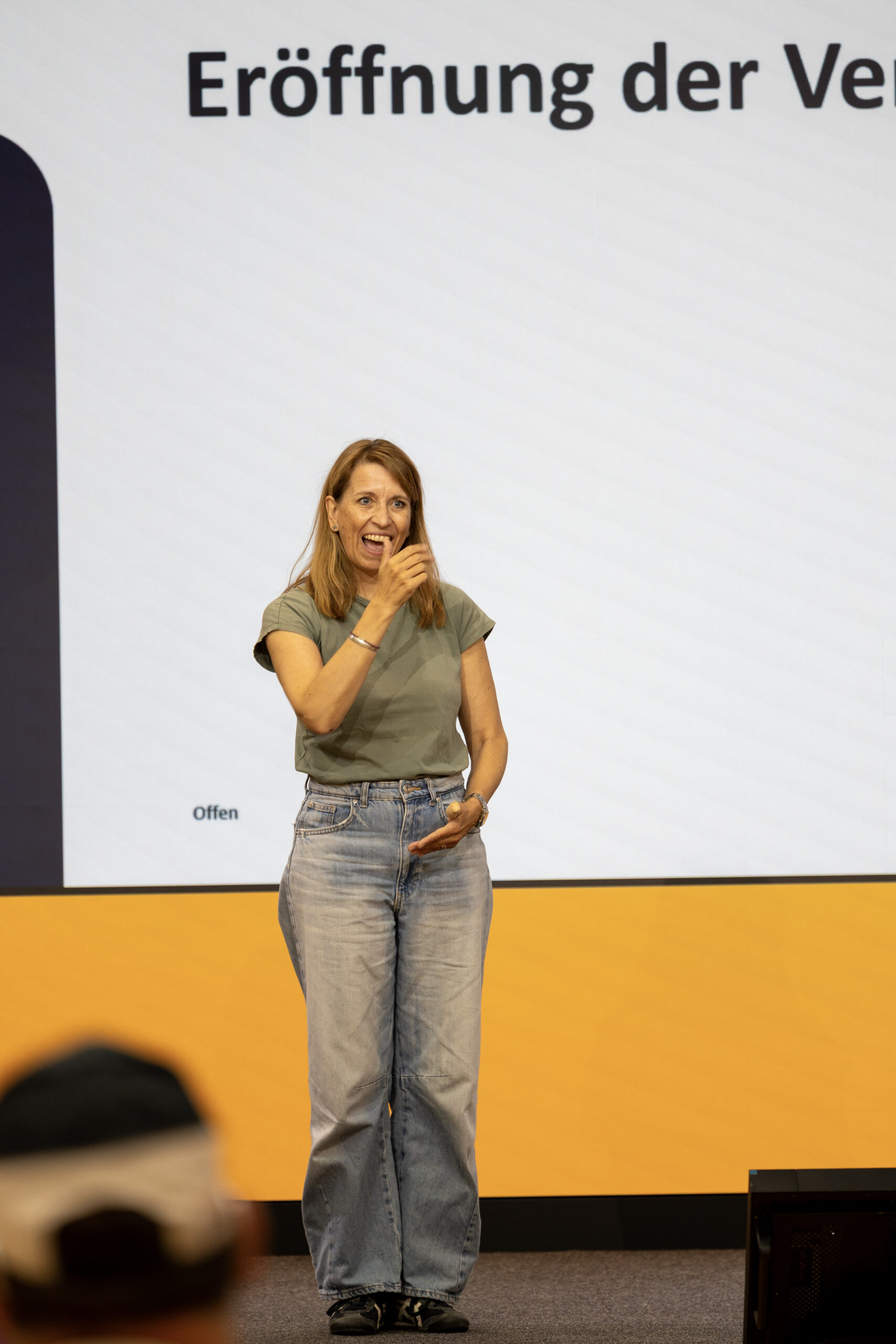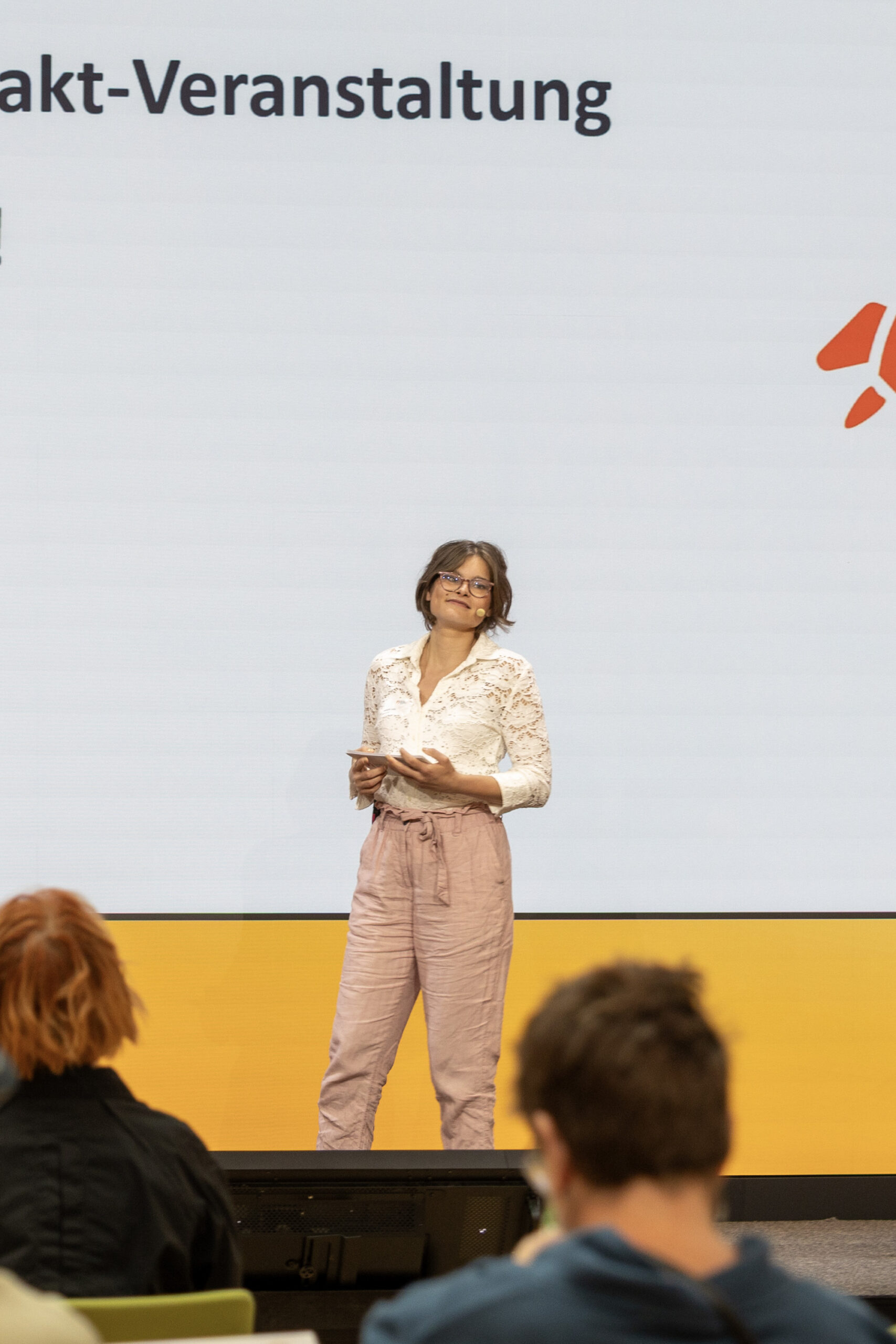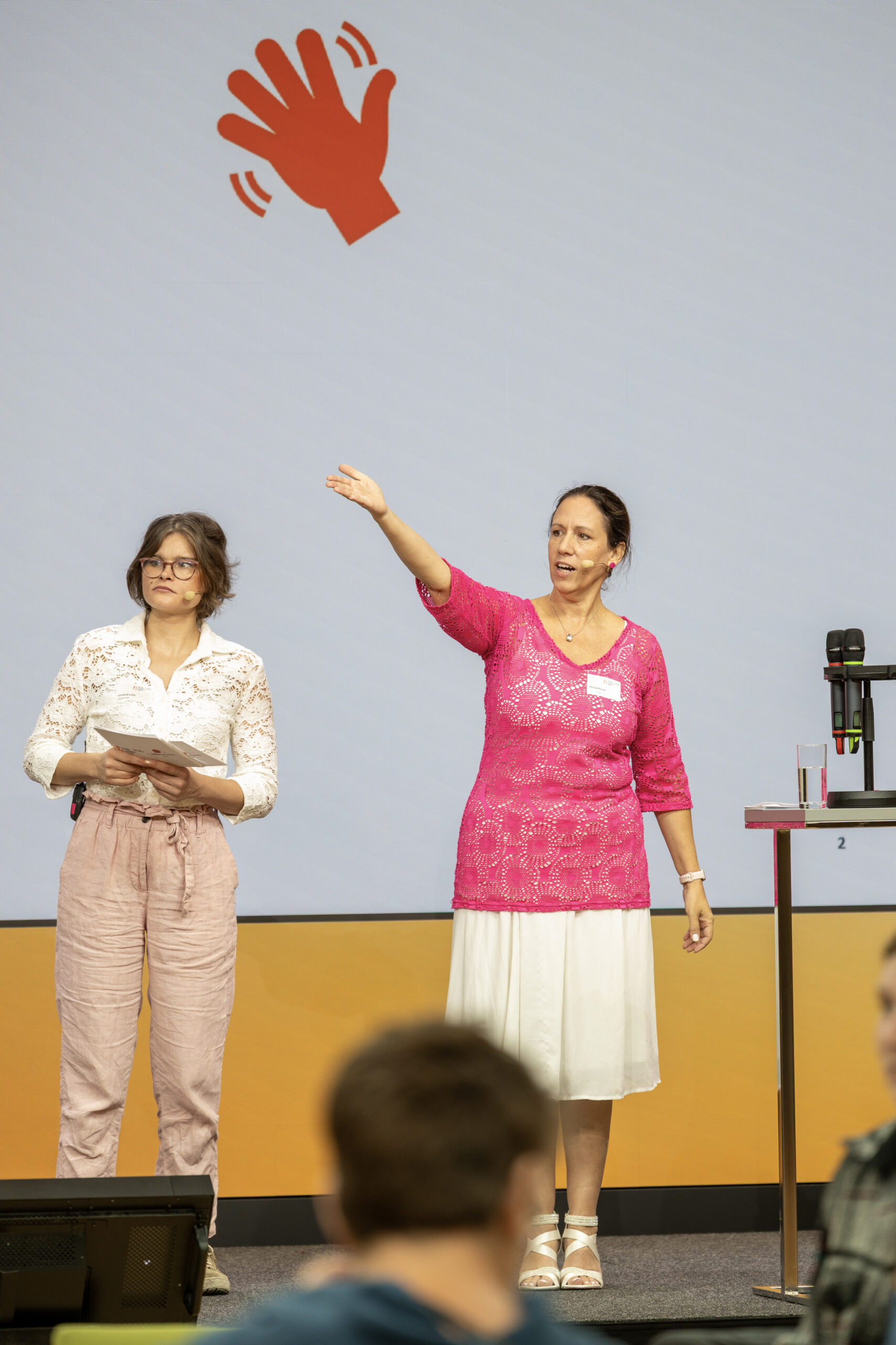 Die kandidat:innen sitzen am Anfang des Raums an einem Tisch. man sieht das Publikum von hinten.