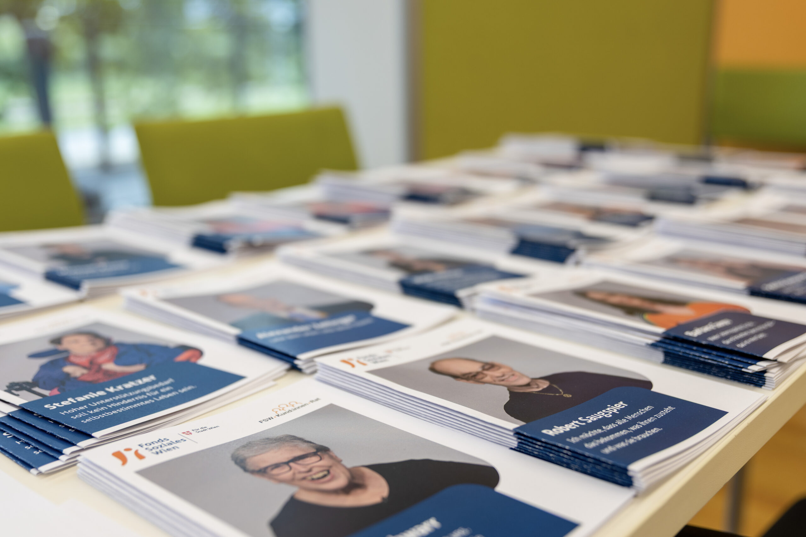 Broschüren zu den Kandidat:innen liegen auf einem Tisch.