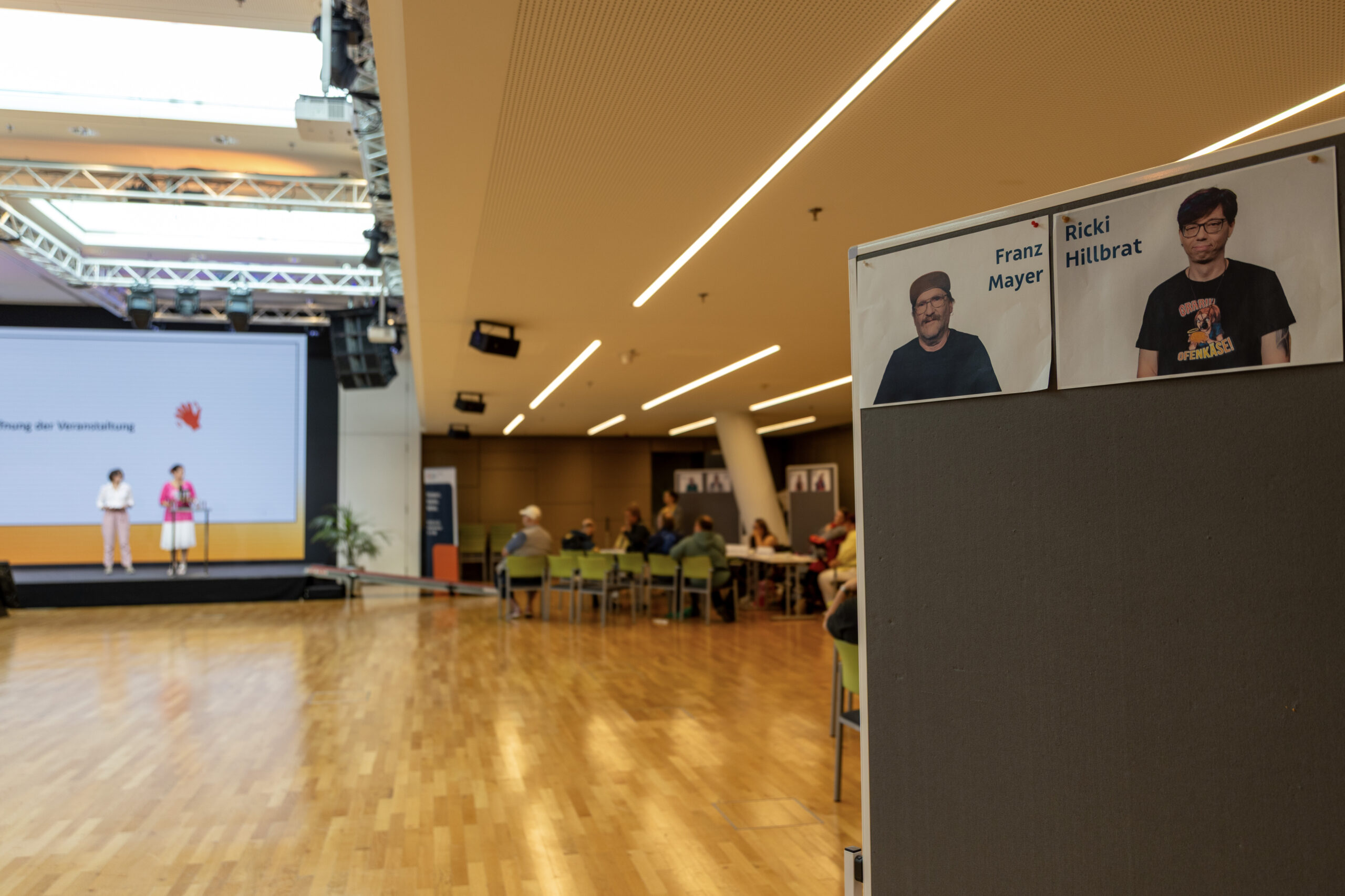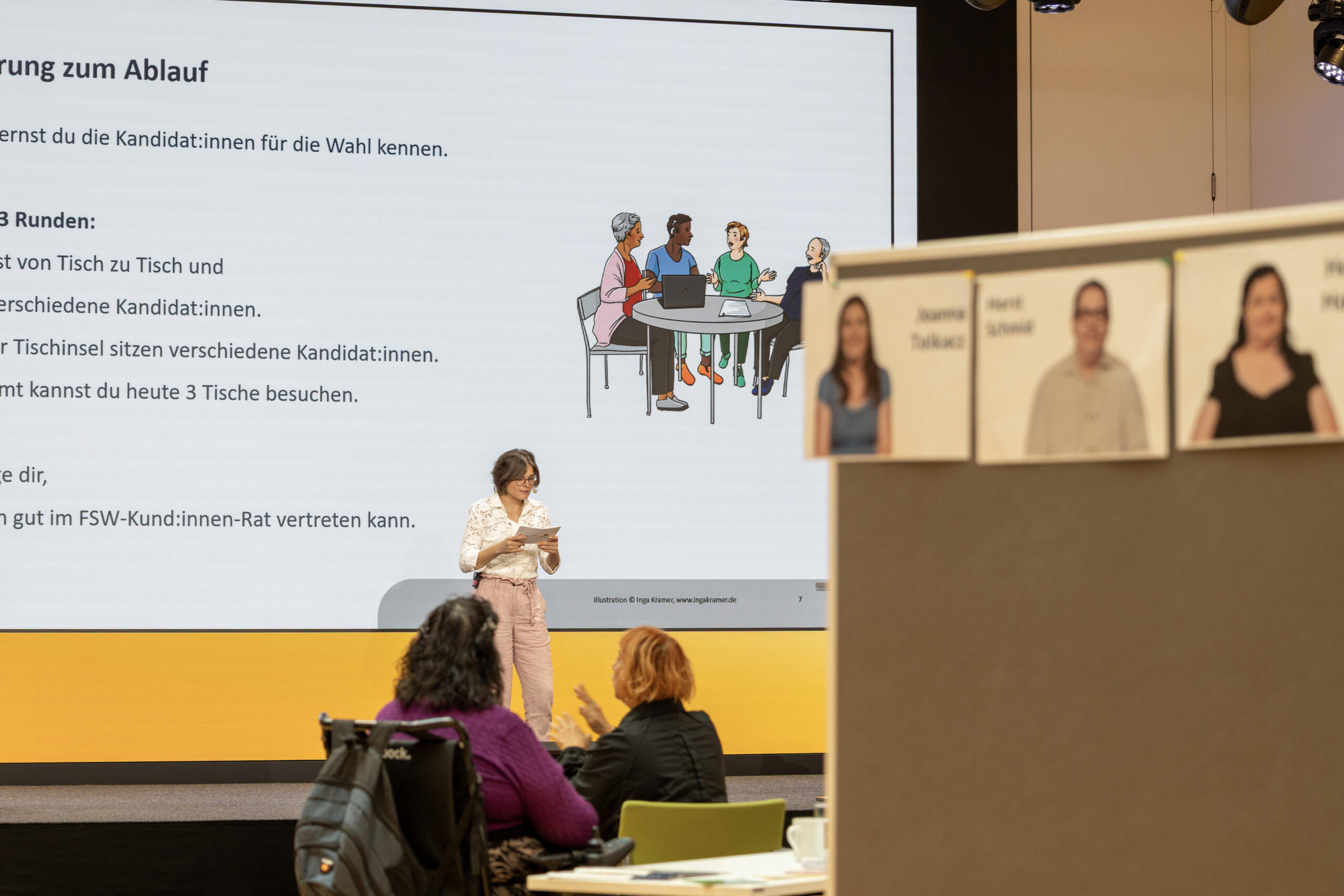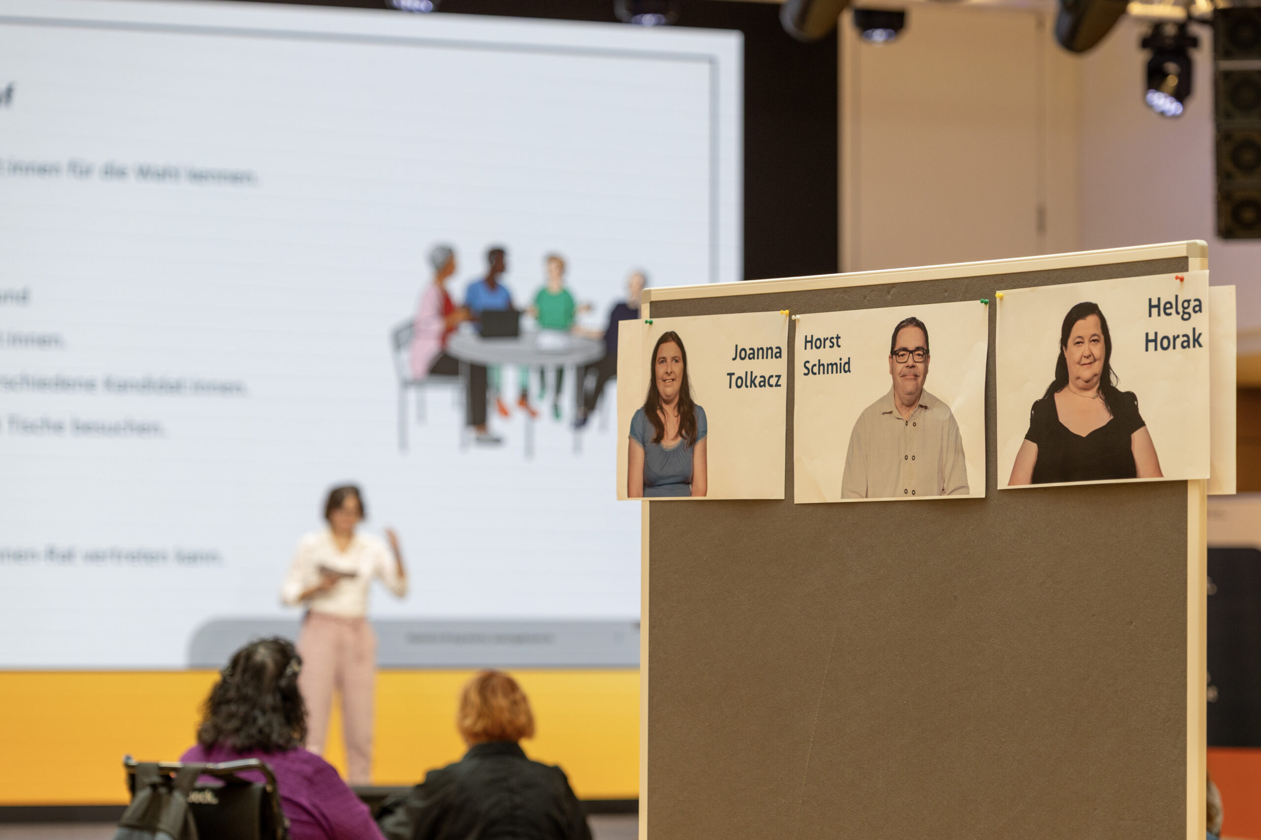 Fotos von Kandidat:innen an einer Pinnwand. Im Hintergrund sieht man die Bühne.