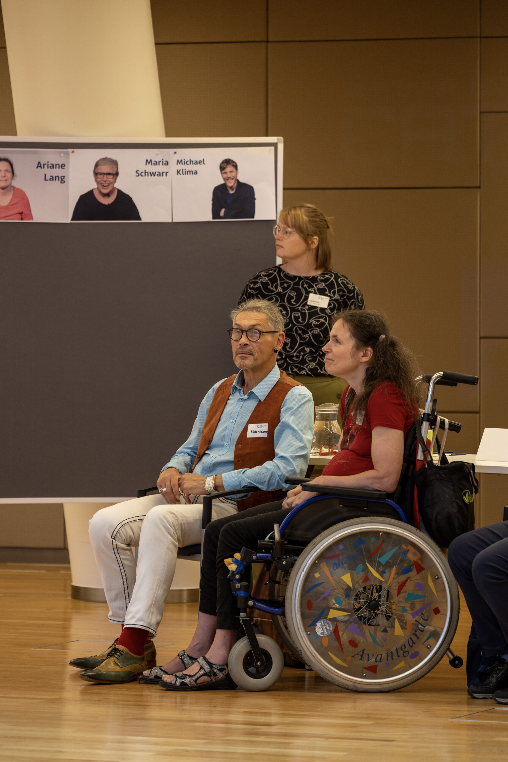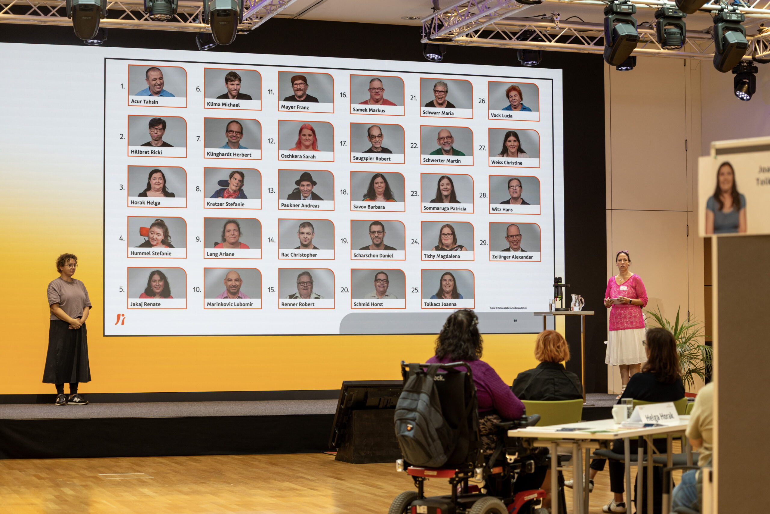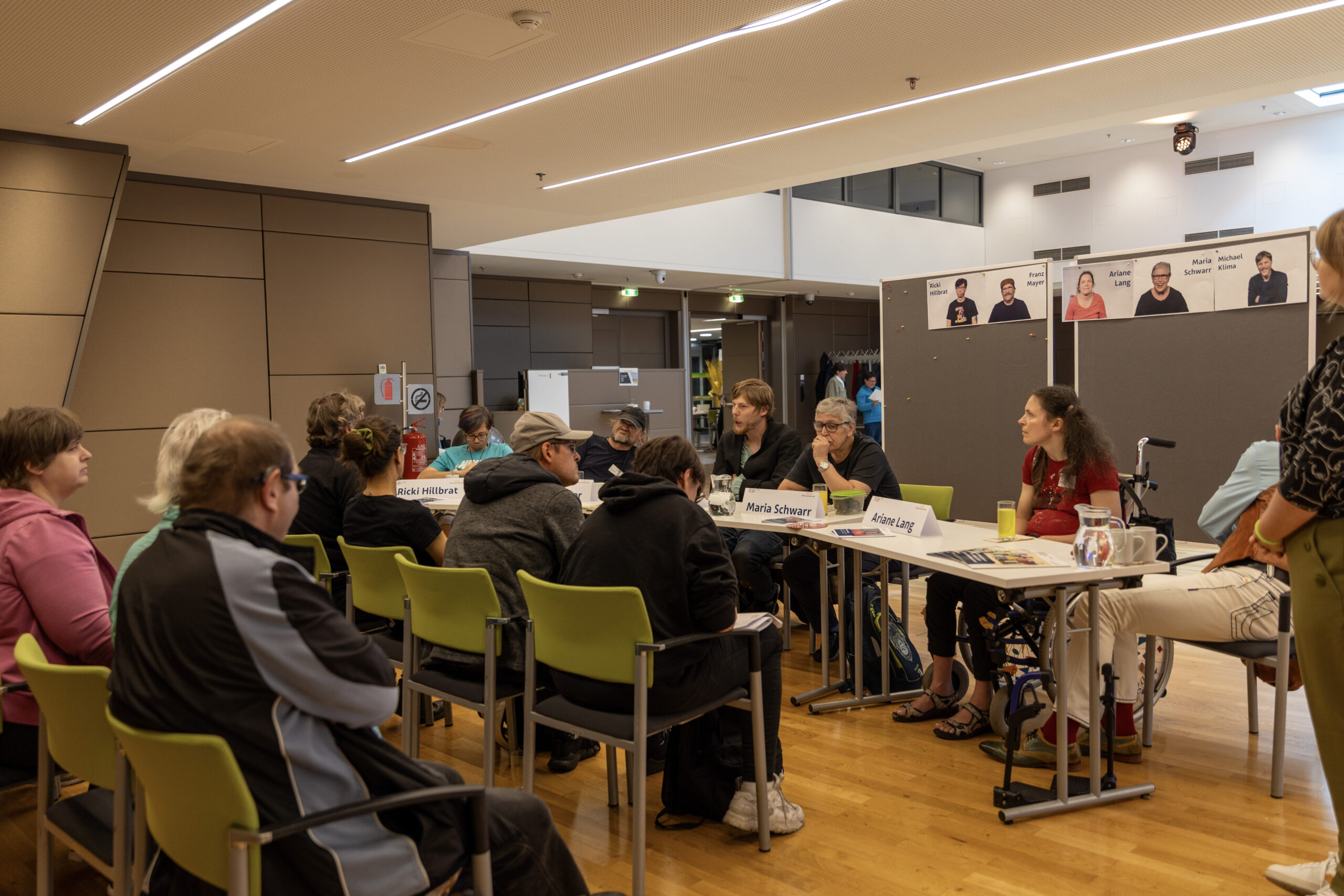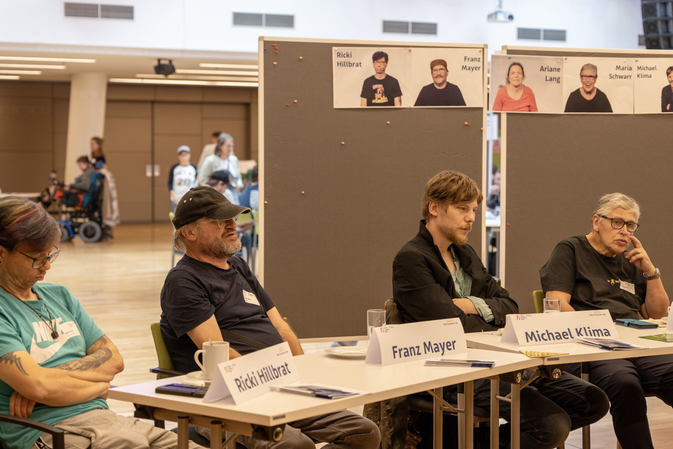 Fotos von Kandidat:innen an einer Pinnwand. Im Hintergrund sieht man die Bühne.