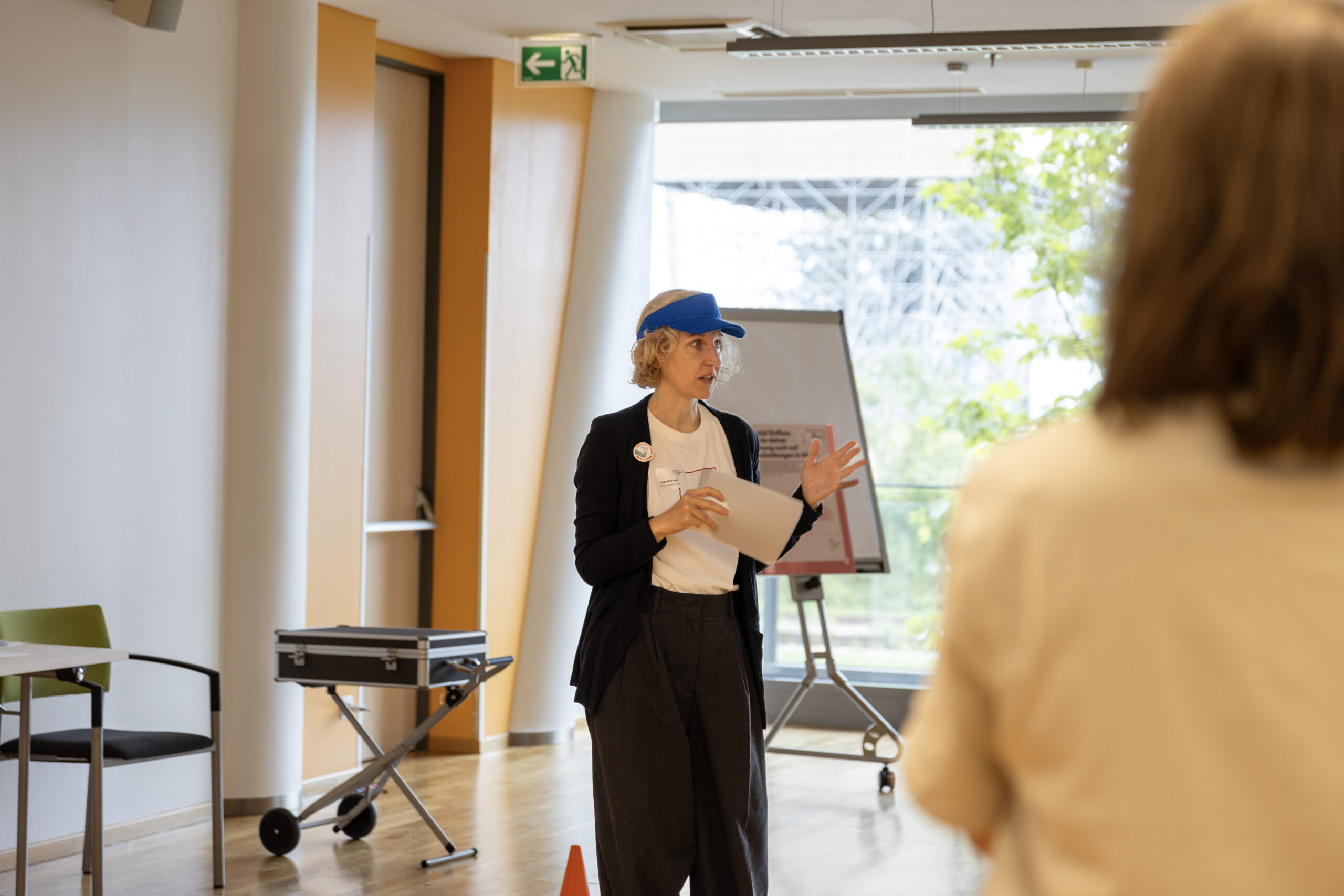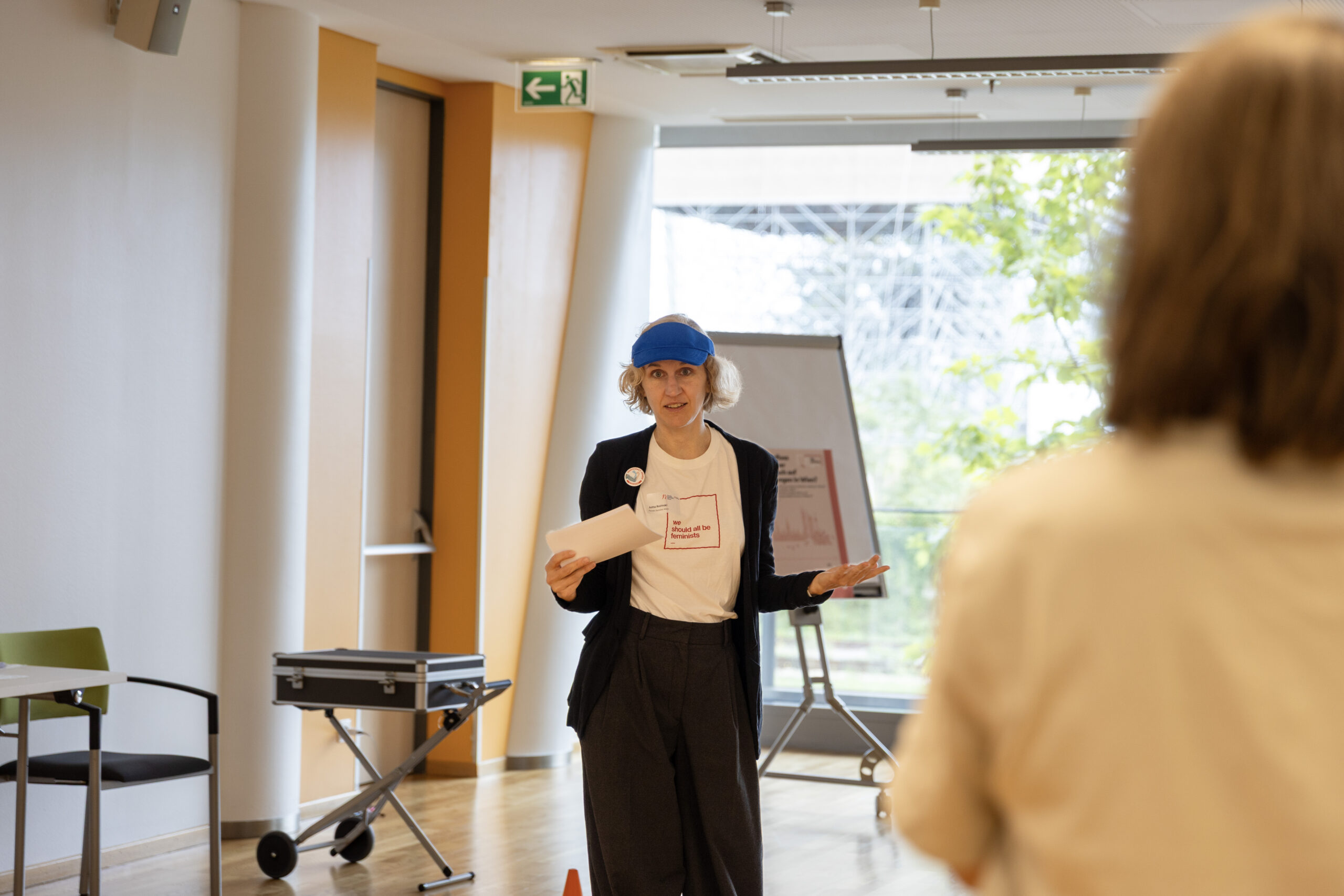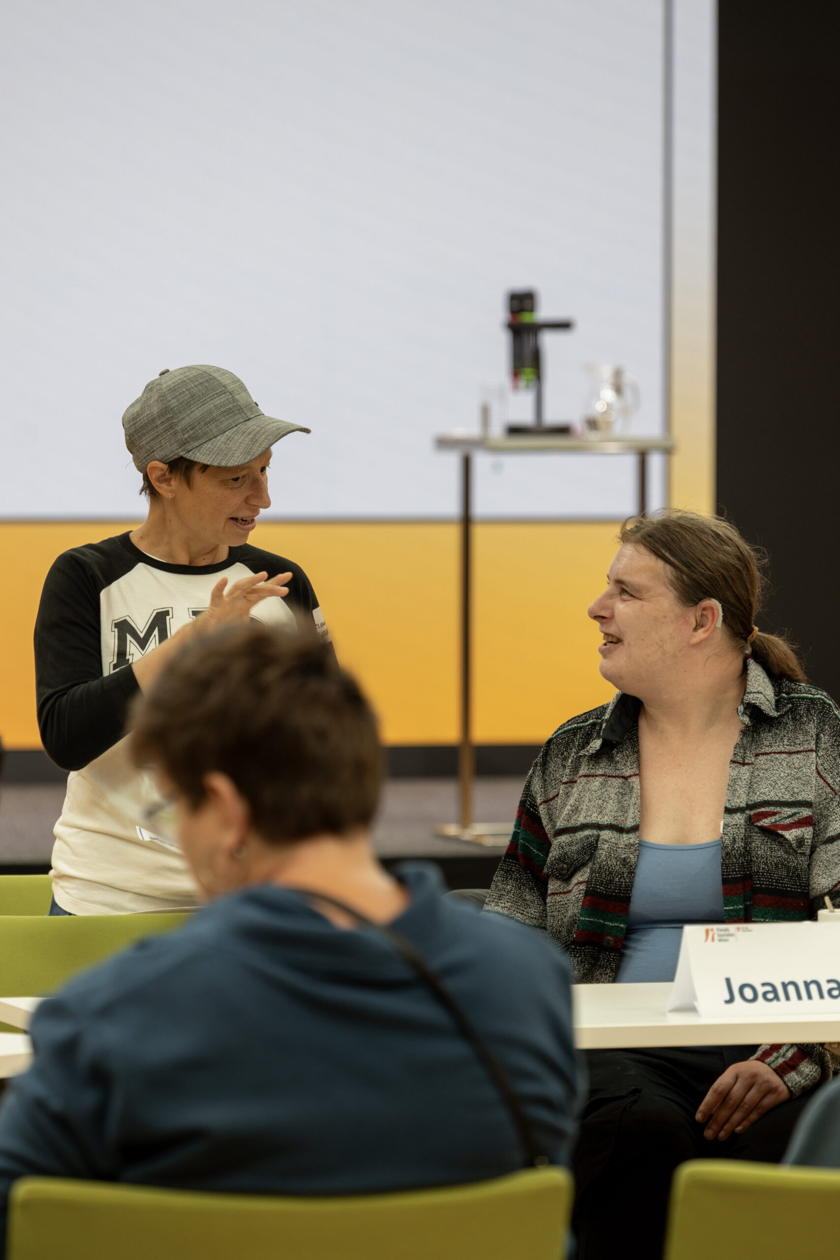 Eine Tisch, eine Frau sitzt, die andere steht. Im Hintergrund pinnt ein Mann etwas an eine Pinnwand.
